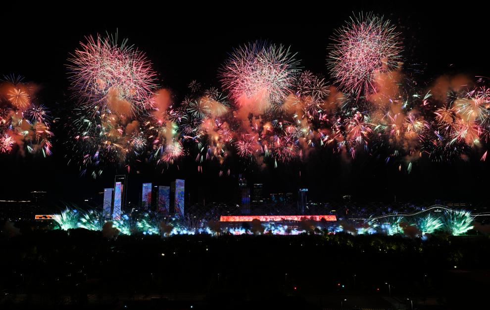 في الصورة الملتقطة يوم 7 أغسطس 2025، ألعاب نارية خلال حفل افتتاح دورة الألعاب العالمية 2025 في تشنغدو بمقاطعة سيتشوان جنوب غربي