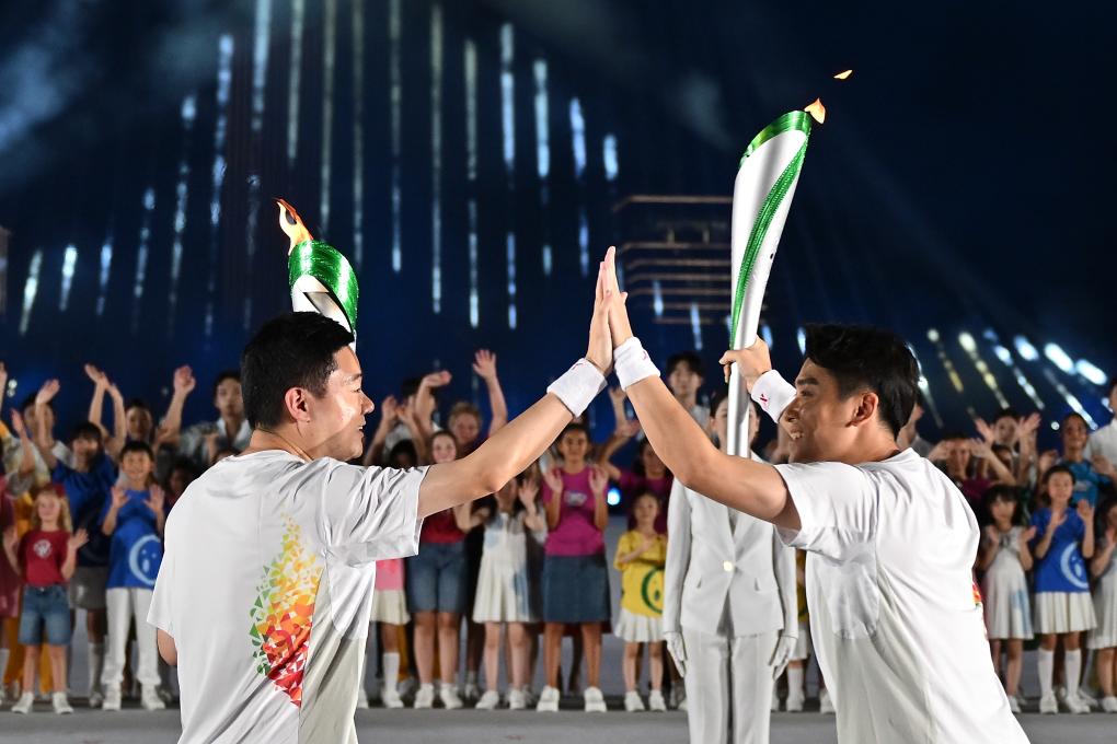 في الصورة الملتقطة يوم 7 أغسطس 2025، حاملا الشعلة دينغ جيون هوي (اليسار) ودونغ دونغ خلال حفل افتتاح دورة الألعاب العالمية 2025 في تشنغدو بمقاطعة سيتشوان