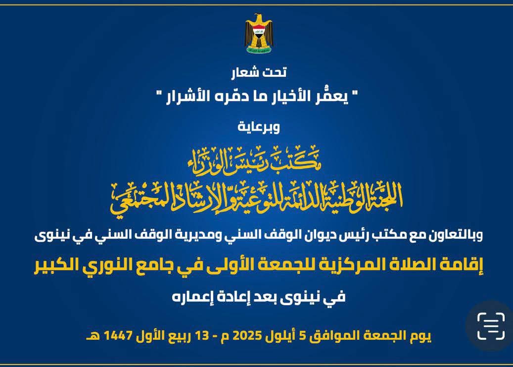 تحت شعار ((يعمر الأخيار ما دمره الأشرار))، وبرعاية مكتب رئيس مجلس الوزراء، شهد جامع النوري الكبير في محافظة نينوى إقامة الصلاة المركزية للجمعة الأولى بعد إعادة بنائه وتأهيله من آثار العدوان الإرهابي الذي طال بنيته وتاريخه وهويته. ويأتي هذا الحدث ضمن جهود الدولة في تعزيز الاستقرار والسلم المجتمعي.