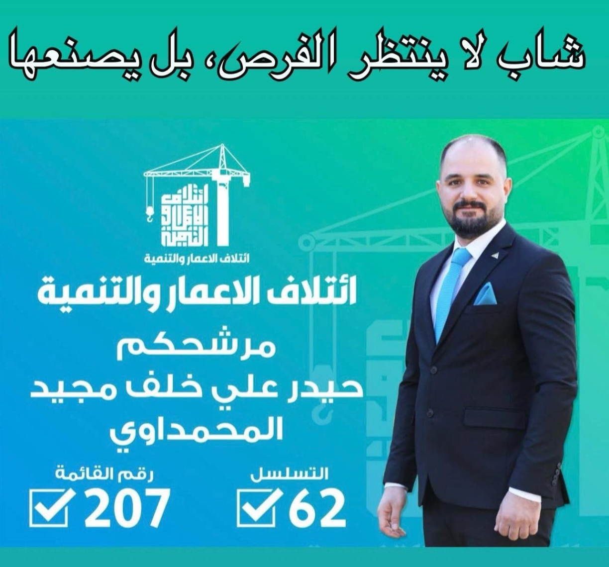 في مشهد انتخابي تتصاعد فيه الوعود والشعارات، يبرز الشيخ حيدر علي خلف مجيد المحمداوي، مرشّح قائمة التنمية والإعمار – رقم (207)، تسلسل (62)، بخطابٍ واقعيٍّ يحمل مشروعًا واضحًا يرتكز على بناء الإنسان ومحاربة الفساد وتمكين الشباب.
